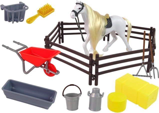 Ova čarobna figura konja s dugom grivom idealna je za česanje i izradu pletenica. Set uključuje i dodatke potrebne za svakodnevni život u štali - kao što su tačke, grablje, vile ili kante za vodu i hranu. Djeca se mogu radovati satima zabave dok se brinu o svom novom životinjskom prijatelju i razvijaju svoju maštu i manuelnu spretnost.