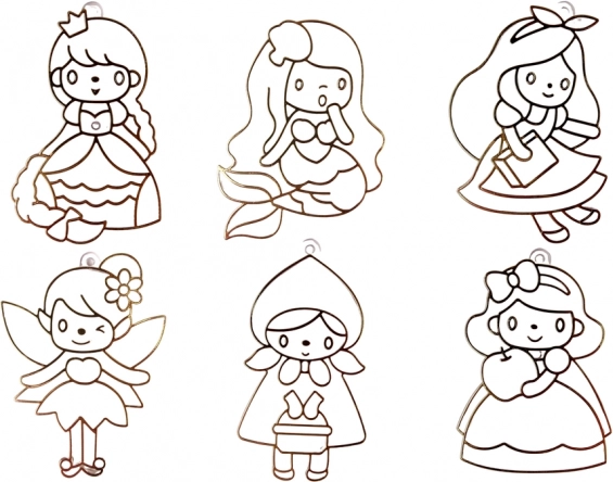 Šest prozirnih motiva princeza spremnih za bojanje pretvara svako poslijepodne u kreativnu radionicu i uljepšava prozore ili ruksake originalnim privjescima.
