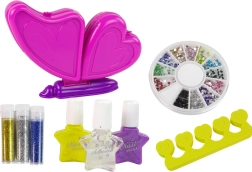 Kombinirajte tri boje lakova s rasutim šljokicama, naljepnicama i kamenčićima. Separator prstiju i rašpica u obliku srca pomažu za precizno i udobno ukrašavanje.