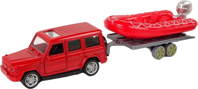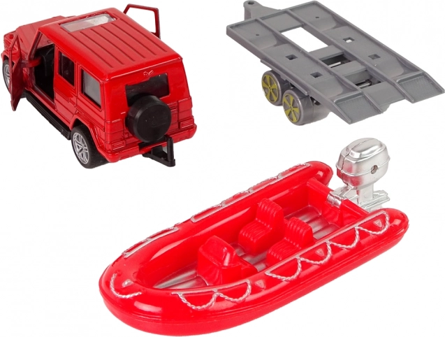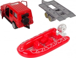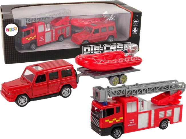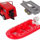Napuhani čamac na prikolici omogućuje spajanje na odabrano vozilo prema vrsti spašavanja. Set upotpunjuju edukativne kartice s različitim vrstama vatrogasnih vozila.