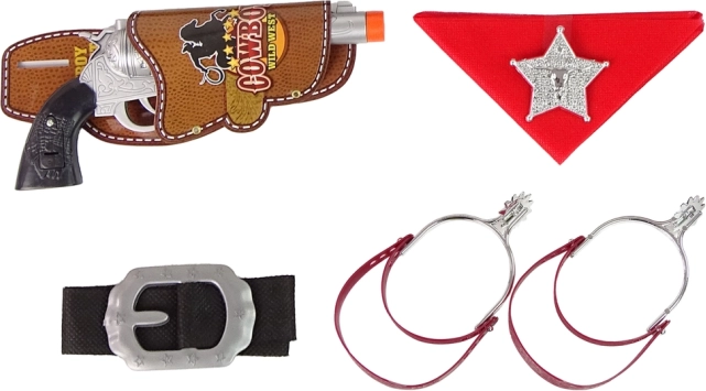 Šerifska značka, crvena marama, remen s kopčom i kaubojske ostruge daju igri stil i samopouzdanje. Savršeno za karneval i kućno maskiranje.