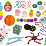 - Pop It (veliki zečić, malo jaje), 2 Pop It narukvice, squishy (uklj. jaje i lopticu), 6 gumenih zmija, 2 rastezljiva zečića, 2 spiner loptice, veliki spiner, mini igraći kontroler s gumbićima, 4 cjevčice, 5 pop tub cijevi, kocka–slagalica, 4 opruge, privjesak “oraščić”, 6 malih loptica s izbočenjima, 2 slagalice za oblike, zečić s igrom križić-kružić
