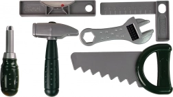 Set uključuje: bušilicu, čekić, pilu, ključ, vijke, matice i drvenu ploču za uvijanje dijelova. Svi alati su napravljeni od sigurnog plastike, prikladni za djecu od 3 godine.