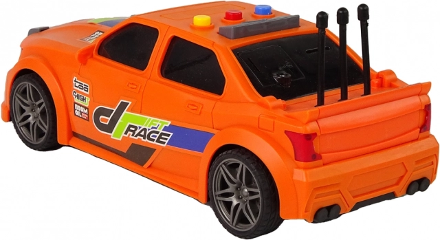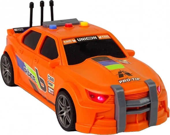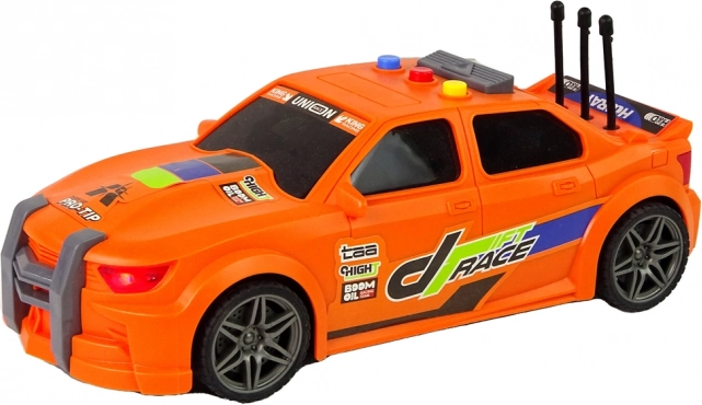 Narančasti trkaći auto s upečatljivim otiscima, sportskim detaljima i pažljivo obrađenim elementima privlači pažnju na prvi pogled. Izdržljiva plastika podnosi često igranje.