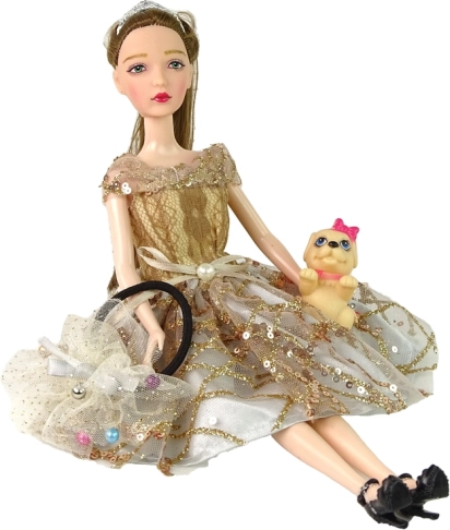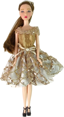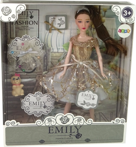 Otkrijte čaroliju modnog svijeta s lutkom EMILY. Njezina sjajna zlatna haljina s vrpcom u struku, uredna frizura i crne cipelice s ukrasom čine ovu lutku elegantnom pratiteljicom za svakodnevnu igru. Plave oči i nježni detalji daju realističan i šarmantan izgled.