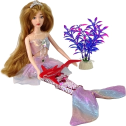 Rep se lako skida, a lutka se može postaviti na nožice, pa djeca dobivaju dva načina igre – kao morska vila i kao klasična lutka. U pakiranju se nalaze dekorativni crveni morski pas i šarena akvarijska biljka, koji proširuju mogućnosti priča i maštovite igre.