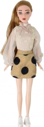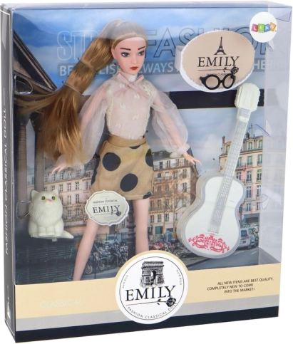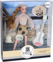Lutka Emily očarava elegantnim izgledom: prozirna bijela bluza s detaljima, smeđa suknja s crnim točkama i bijele tenisice. Dugu plavu kosu skupljenu u rep upotpunjuju crne naočale. Bijela gitara s ružičastim ukrasima poziva na kreativnu igru i pripovijedanje vlastitih priča s vjernom mačkicom uz bok.