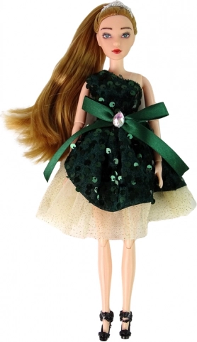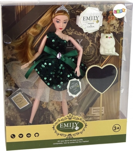 Unesite čaroliju u dječju igru s lutkom Emily – elegantnom lutkom s dugom plavom kosom, zlatnim tijarom i haljinom sa zelenim štrasom. Pokretni udovi omogućuju prirodno poziranje i lako insceniranje modnih revija i priča.