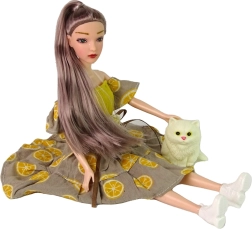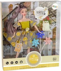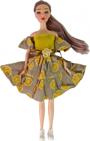 Lutka Emily ima dugu kosu, prekrasnu haljinu s uzorkom citrusa i bijele cipelice. Zglobni udovi omogućuju prirodne poze.