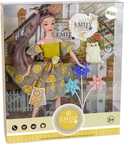 Otkrijte čarobni set za kreativnu igru – lutka Emily s tri vjetrenjače i preslatkim mačićem. Poticanje mašte, socijalnih vještina i nudi beskrajnu zabavu. Lutka ima zglobne udove, dugu kosu i haljinu s citrusnim uzorkom, a mačić pri pritisku ispušta zvižduk.
