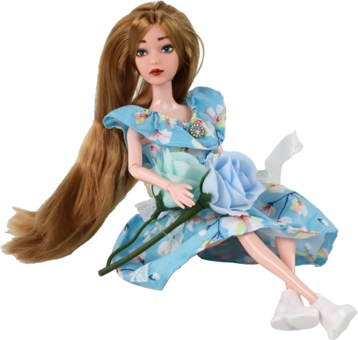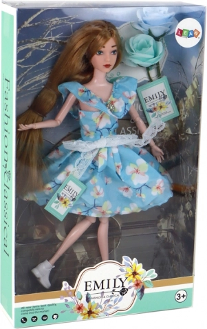 Lutka Emily (30 × 7 × 4 cm) idealna je pratiteljica za svakodnevnu igru. Dugu kosu u nijansi tamne plavuše lako je češljati i ukrašavati, pa djeca mogu stvarati bezbroj frizura. Plavu haljinu s cvjetnim uzorkom krasi čipkana mašnica i mali “dijamantni” detalj na izrezu koji daje elegantan izgled.