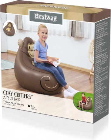 Napuhujuća fotelja u obliku majmuna je lagana, prenosiva i vrlo lako skladištiva. Zbog svog atraktivnog dizajna i robusne konstrukcije idealna je za korištenje kako unutra, tako i na otvorenom.