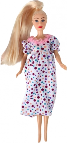 Lutka Lucy je lijepo izrađena igračka s dugom, sjajnom plavom kosom koju je moguće raščešljavati i oblikovati. Nježno oslikano lice daje lutki realističan izgled, što dodatno pojačava njezin šarm. Odjevena je u bijelu trudničku haljinu s šarenim točkicama.