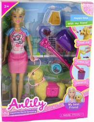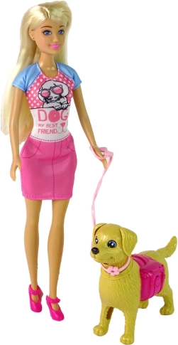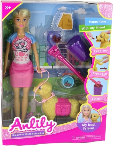 Preslatki set za ljubitelje životinja: lutka sa psićem kojeg možeš nahraniti, povesti u šetnju na povodcu i učiti se brizi i odgovornosti. Lutka ima pokretne udove, psić reagira pokretom repa, ušiju i njuške, a u kompletu su i zdjelica s granulama, povodac, koš i lopatica.