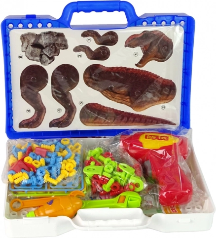 - Upute, kofer, 2 ploče s dijelovima tijela dinosaura, 8 ploča s figurama, plastični šareni vijci i kapice, igračka bušilica, odvijač, 2 ključa