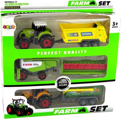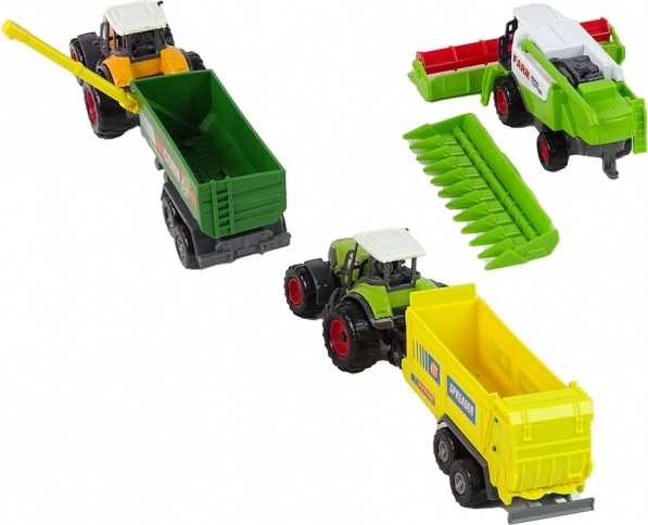 Set nudi sve za malog farmera: dva traktora s različitim prikolicama i funkcionalni kombajn. Svaki je dio dizajniran da vjerno oponaša stvarne poljoprivredne strojeve – od oblika do kolorita. Lako manevriranje i kompatibilni vučni elementi omogućuju brzo mijenjanje kombinacija i stvaranje novih scenarija igre.