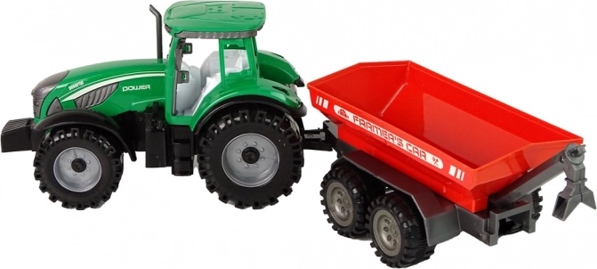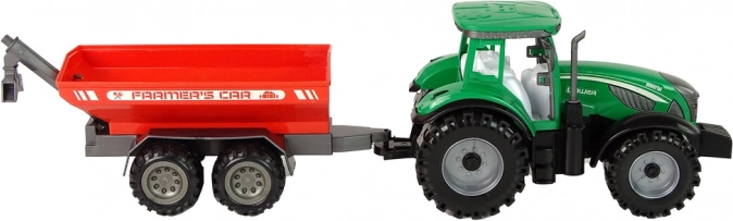 zeleni traktor s crvenom prikolicom s zamašnjakom