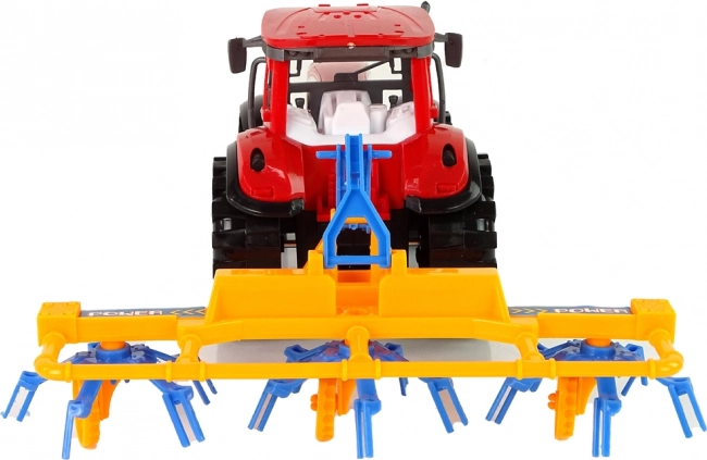 Stražnji narančasto-plavi grabljač se pri vožnji okreće i simulira stvarni rad na polju. Potiče maštu i igru uloga.