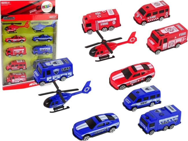 Ovaj univerzalni set donosi kompletan spasilački tim – 5 policijskih i 5 vatrogasnih vozila uključujući helikoptere. Kompaktne dimenzije autića olakšavaju hvatanje i upravljanje te potiču realističnu igru kod kuće i na putu.