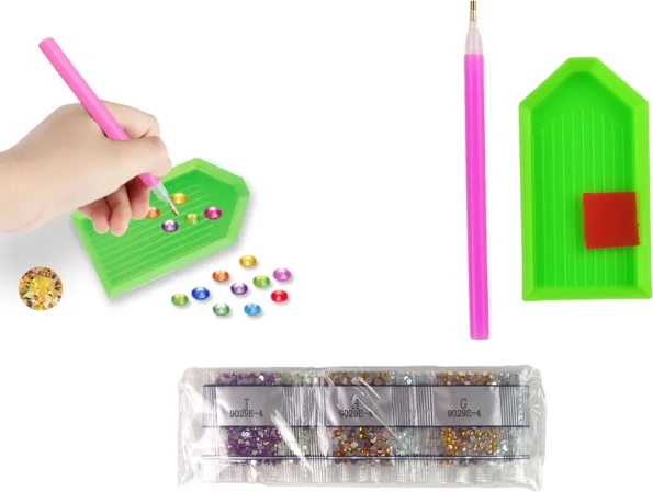 U setu ćete pronaći različite boje kristala koje ćete koristiti za dekoraciju naljepnica. Površina naljepnica je prekrivena ljepljivim slojem, s numeracijom za upotrebu boja. Kristale dodajte jedan po jedan i stvorite malo umjetničko djelo.