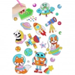 Set sadrži sve potrebno za izradu blještavih naljepnica koje će razveseliti svakog ljubitelja stvaralaštva. Ova kreativna aktivnost potiče strpljenje, preciznost i manualnu vještinu. Svaka naljepnica ima površinu s ljepilom i oznakama za boje dijamanata koje treba pričvrstiti. Napravite malo umjetničko djelo lijepeći kamenčić po kamenčić! Naljepnice prikazuju svemirske rakete, leteće tanjure, astronaute u likovima životinja i male planete.