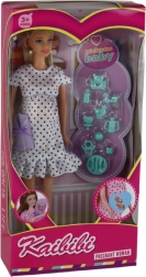 Lutka se ponosi elegantnim izgledom u bijeloj haljini s crnim točkicama, ružičastim cipelama, a modni dodatak je mala torbica.