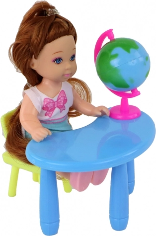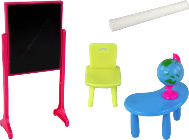 Otkrijte sjajan set igračaka koji uključuje učiteljicu i učenicu, odjevene u elegantnu i stilsku odjeću. Set nadopunjuje ploča s kredom, stolić i stolica, savršeni za stvaranje školskog okruženja. Globus pruža odlične mogućnosti za igru učenja i istraživanja svijeta.