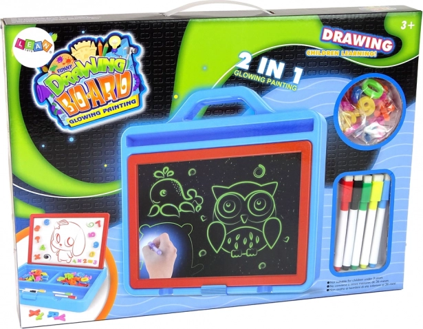Ova dječja ploča potiče maštu i učenje na zabavan način. Uz pomoć LED flomastera djeca stvaraju na posebnom panelu sjajne slike koje u polumraku doslovno ožive. Druga strana služi kao bijela ploča za pisanje i crtanje brisivim markerima, pa mogu vježbati slova, brojke i prve račune uvijek iznova.