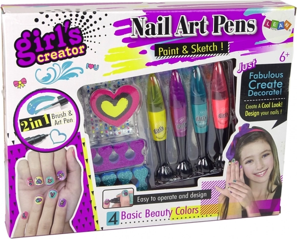 Kreativni dječji set za manikuru s 4 obojena flomastera za nokte, turpijom i razdjelnicima za prste. Netoksičan sastav, siguran prema normi EN71, idealan za djecu od 6 godina za razvoj kreativnosti i fine motorike.