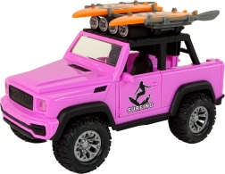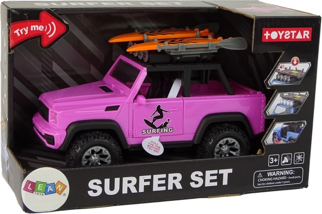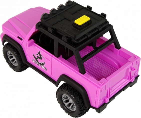 Uživajte u ljetnoj atmosferi s ružičastim off-road vozilom na temu surfanja. Realistični detalji, veliki kotači i pogon na zamašnjak osiguravaju glatku vožnju, dok svjetla i zvukovi pretvaraju svaku vožnju u avanturu. Daske za surfanje i vesla na krovnom nosaču potiču maštu i pozivaju na priče s plaže.