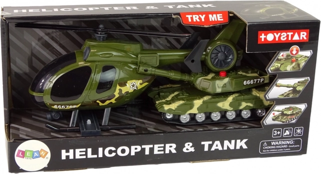 Set sadrži tenk i helikopter u usklađenom maskirnom uzorku – spremno za akciju odmah nakon raspakiravanja.
