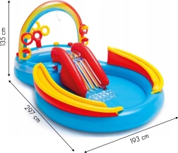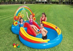 Napuhujuće vodeno igralište Intex spaja plitki bazen, tobogan i interaktivne elemente u jedan šareni centar zabave. Dugin luk s raspršivačem stvara osvježavajuću vodenu zavjesu niz koju se djeca sigurno spuštaju toboganom na mekanu podlogu za doskok. Dvije vodene zone različite dubine idealne su za razne dobne skupine.