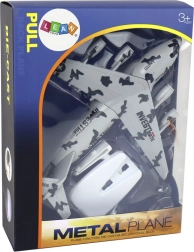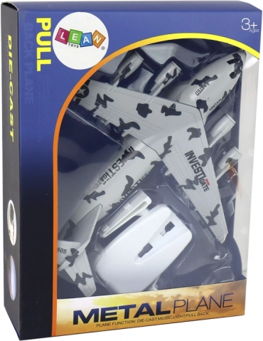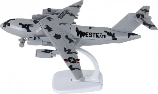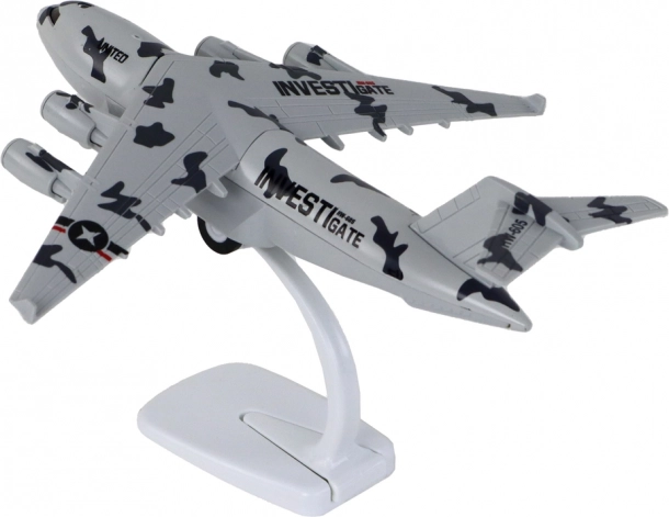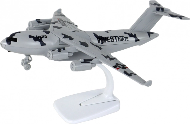 Realističan model zrakoplova s maskirnim uzorkom i natpisom UNITED oduševit će male i velike ljubitelje zrakoplovstva. Nudi svjetlosne i zvučne efekte, inercijski (pull-back) pogon za vožnju po podlozi i četiri motora za autentičan izgled. U pakiranju se nalazi i postolje za atraktivno izlaganje. Certifikati CE i EN71, prikladno od 3 godine.