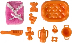 Set sadrži mnogo dodataka, uključujući četku, dudu, bočicu i druge, koji djeci omogućuju razigranu brigu o lutkama.