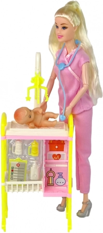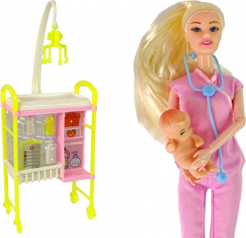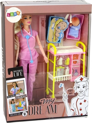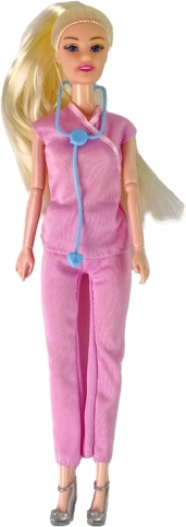 - Lutka je odjevena u ružičasto radno odijelo s plavim stetoskopom oko vrata, spremna za zbrinjavanje malih pacijenata.