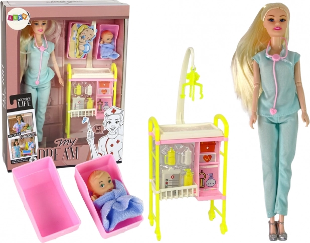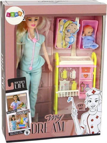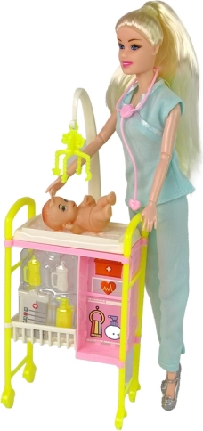 Pripremite se za fascinantan svijet medicine s ovom iznimnom lutkom. Odjevena u tipičnu liječničku odoru s dugom plavom kosom, unosi autentičnu atmosferu u svaku igru. Ružičasti stetoskop daje na vjerodostojnosti, dok priloženi dodaci poput bebe i medicinskih kolica potiču kreativnu igru.
