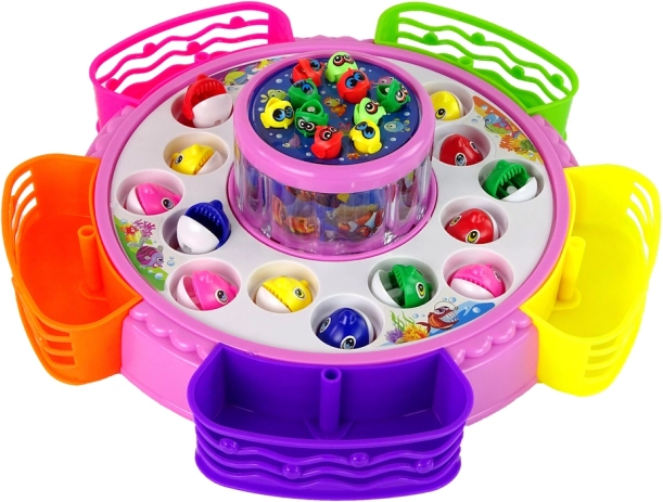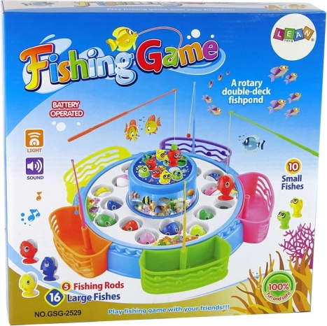 Pokrenite zabavu s interaktivnom igrom pecanja ribica! Igraća ploča se nakon uključivanja okreće, svijetli i svira zvukove, dok igrači pomoću štapova love šarene ribice. Različite veličine ribica i štapova (uključujući magnetne štapove) donose raznolikost i izazov za mlađu i stariju djecu.