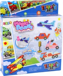 Paket nudi 8 boja (žuta, narančasta, ružičasta, crvena, crna, bijela, tamnoplava, plava), dvije prozirne podloge s iglicama (kvadrat i šesterokut), pincetu, aplikator, raspršivač, 4 viseća kolutića i knjižicu s predlošcima – savršen izbor za početnike i male stvaratelje koji vole motive prometa.