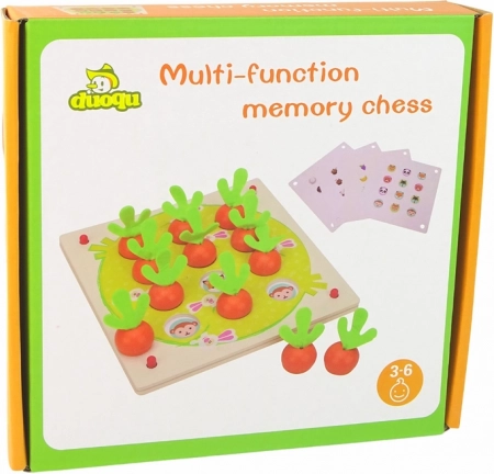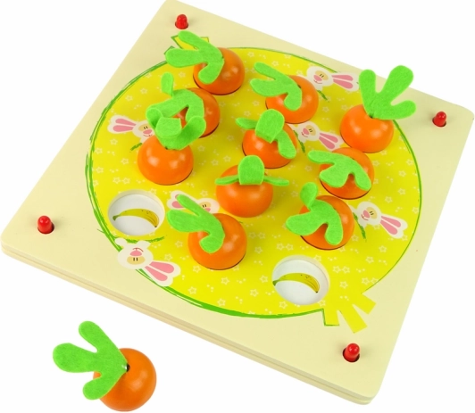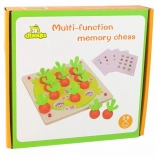 Ova kvalitetna drvena igra potiče koncentraciju i trenira pamćenje na zabavan način. Djeca umeću simpatične figurice voća i povrća u odgovarajuće otvore prema odabranom predlošku i traže odgovarajuće parove. Robusna izrada osigurava dug vijek trajanja i sigurnu igru.