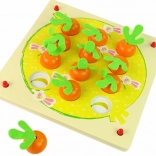 Čvrsta drvena ploča s glatkim otvorima i šarene figurice voća i povrća pristaju dječjim ručicama i potiču finu motoriku.