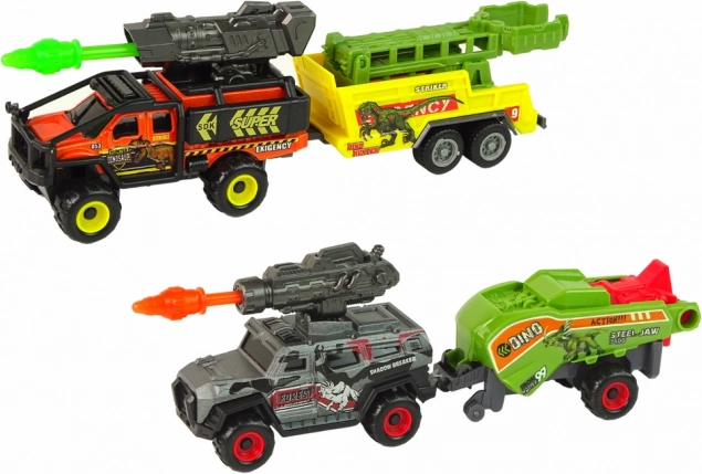 Ovaj set uključuje dva igračka vozila s prikolicama za prijevoz dinosaura. Svako vozilo je opremljeno rotirajućim lanserom, što dodaje akcijski element u igru. Detaljna izrada ovih vozila čini igru još zanimljivijom.