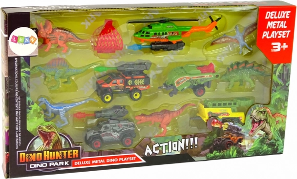 Igračka 'Dino Hunter' Deluxe Metal Dino Playset sadrži različite plastične dinosaure, vozila i helikopter. Djeci nudi akcijsku i avanturističku igru punu mašte.