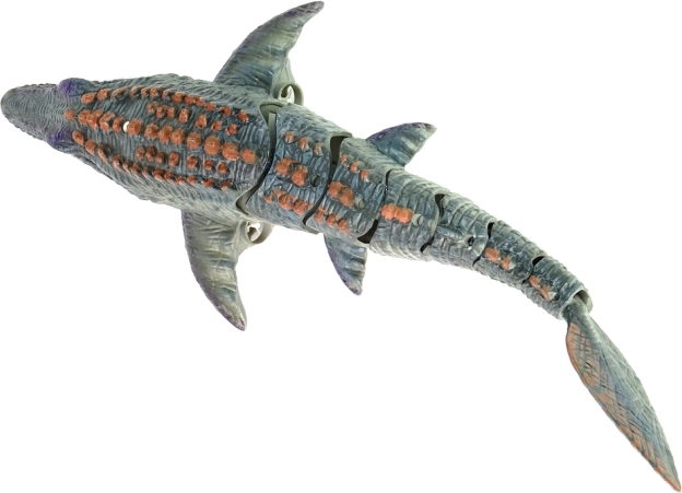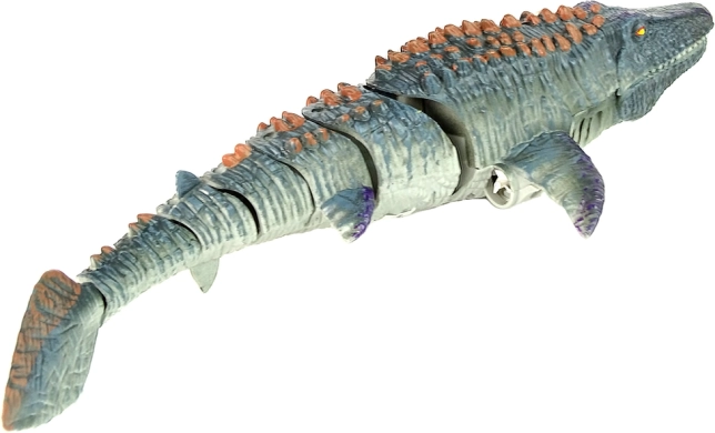 Dinosaur ima pokretni rep zahvaljujući kojem može slobodno plivati pod vodom. Pomoću smeđeg daljinskog upravljača (13 cm x 7 cm x 4 cm), koji radi na 2 AA baterije od 1,5 V (nisu uključene), možete upravljati njegovim pokretima: gore, dolje, desno, lijevo, unatrag, naprijed. Daljinski upravljač ima dodatno 2 tipke za aktivaciju vodenog raspršivača smještenog na stražnjem dijelu ove vodene gušterice.