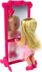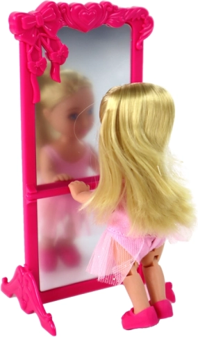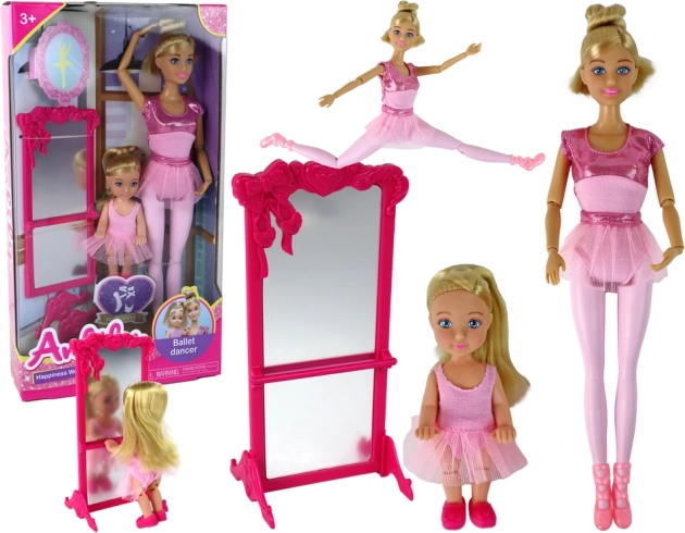 Elegantna baletna mama u ružičastom kostimu sa svjetlucavim detaljima i tilskom suknjom uči svoju malu balerinu prve piruete. Obje lutke nose ružičaste baletne cipelice i dugu plavu kosu uređenu za sat plesa. Veliko ružičasto ogledalo s dekoracijama stvara čarobnu pozornicu za svakodnevni trening i velika izvođenja.