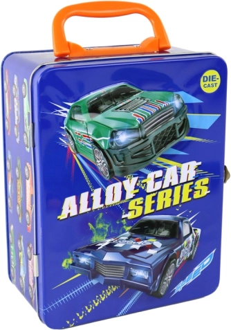 Dio seta je i stilski limeni kofer s motivom sportskih automobila, metalnim zatvaranjem i sklopivom ručkom. Unutra se nalaze pregledne pregrade za sigurno odlaganje autića – savršeno za male kolekcionare na putu i u dječjoj sobi.