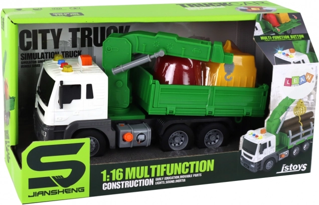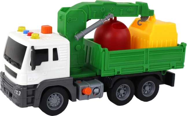 Interaktivna dizalica na krovu podiže se pritiskom narančastog gumba, pa djeca mogu utovarivati i istovarivati kontejnere. U paketu su 2 obojene kante i 4 kartice s vrstama otpada koje kroz igru uče principe recikliranja i ekologije. Kompaktne dimenzije idealne su za igru u kući i na otvorenom.