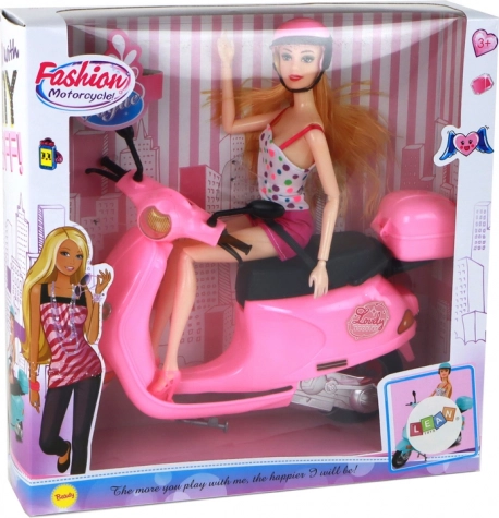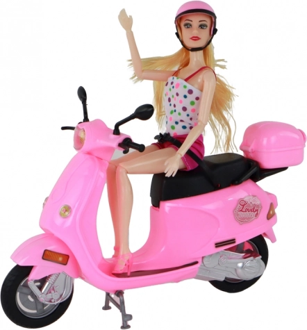 Slatka lutka na ružičastom skuteru donosi sate kreativne zabave. Ima dugu plavu kosu, uklonjivu ružičastu kacigu i pokretne ruke i noge. Ružičasti skuter s okretnim upravljačem i kotačima koji se slobodno kotrljaju potiče maštovitu igru i sigurnu vožnju zahvaljujući pričvršćenju lutke. Pogodno za djecu od 3 godine, CE certifikat i usklađenost s EN71.
