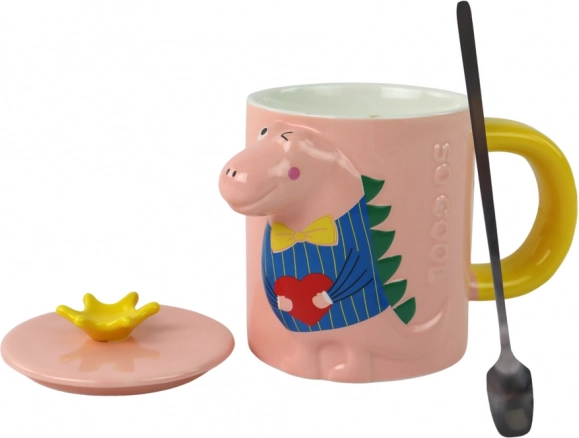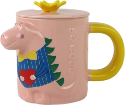 Ova stilska keramička šalica spaja funkcionalnost i razigrani dizajn. Ružičasto tijelo sa žutom drškom upotpunjuje poklopac sa žutom krunom, koji štiti napitak i zaokružuje originalan izgled. Reljefni 3D motiv dinosaura svakom gutljaju daje dozu radosti – idealno za kavu, čaj i kakao.