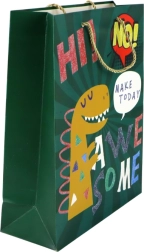 Stilna papirnata poklon-vrećica u tamnozelenoj boji s veselim motivom dinosaura i suptilnim svjetlucavim detaljima. Zahvaljujući čvrstim zlatnim ručkama od uzice, praktična je, izdržljiva i izvrsno pristaje za rođendane, dječje proslave i blagdane.