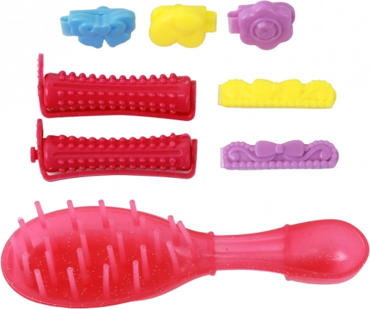 Dio pakiranja su svi potrebni dodaci za stvaranje jedinstvenih frizura – dva uvijača, pet raznih kopči i stilizirana četka. S ovim setom možete razvijati kreativnost i stilističke vještine vašeg djeteta.